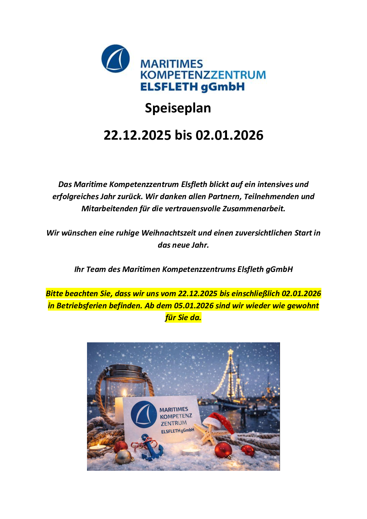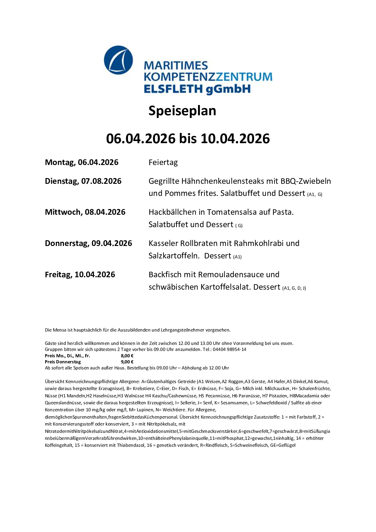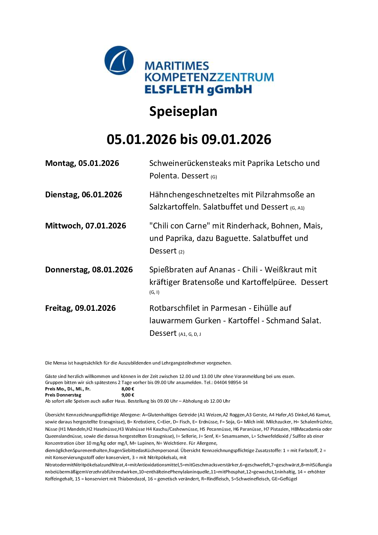 Die Mensa ist hauptsächlich für die Schiffsmechanikerazubis und Lehrgangsteilnehmer vorgesehen, Einzelne Gäste können auch mittags essen, müssen sich aber spätestens am gleichen Tag bis 09:00 Uhr anmelden.